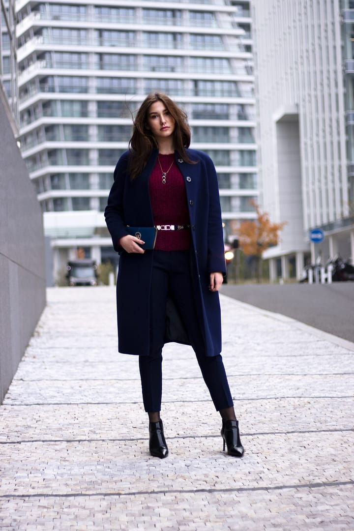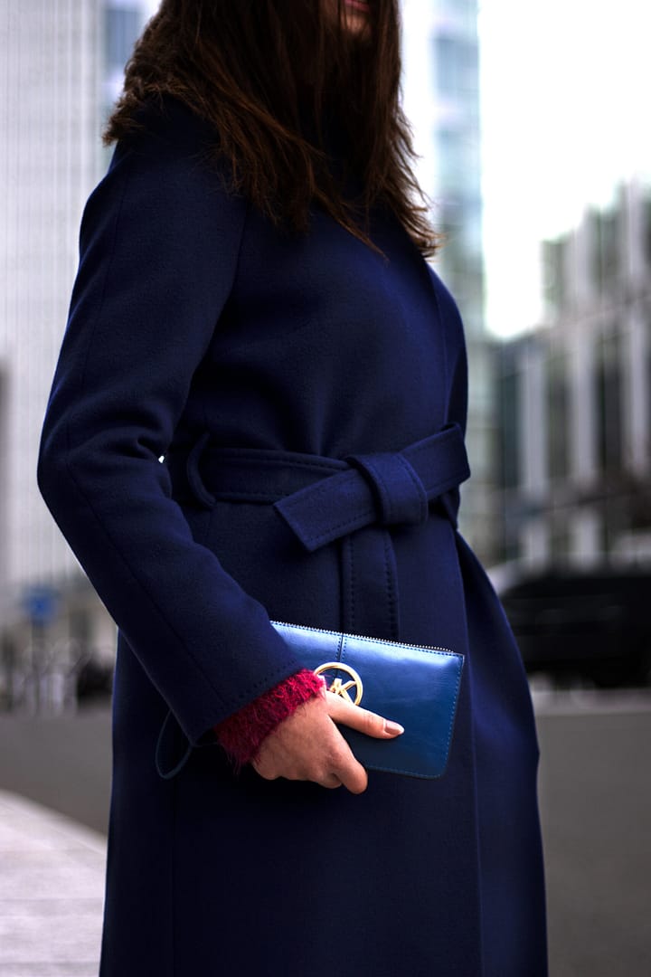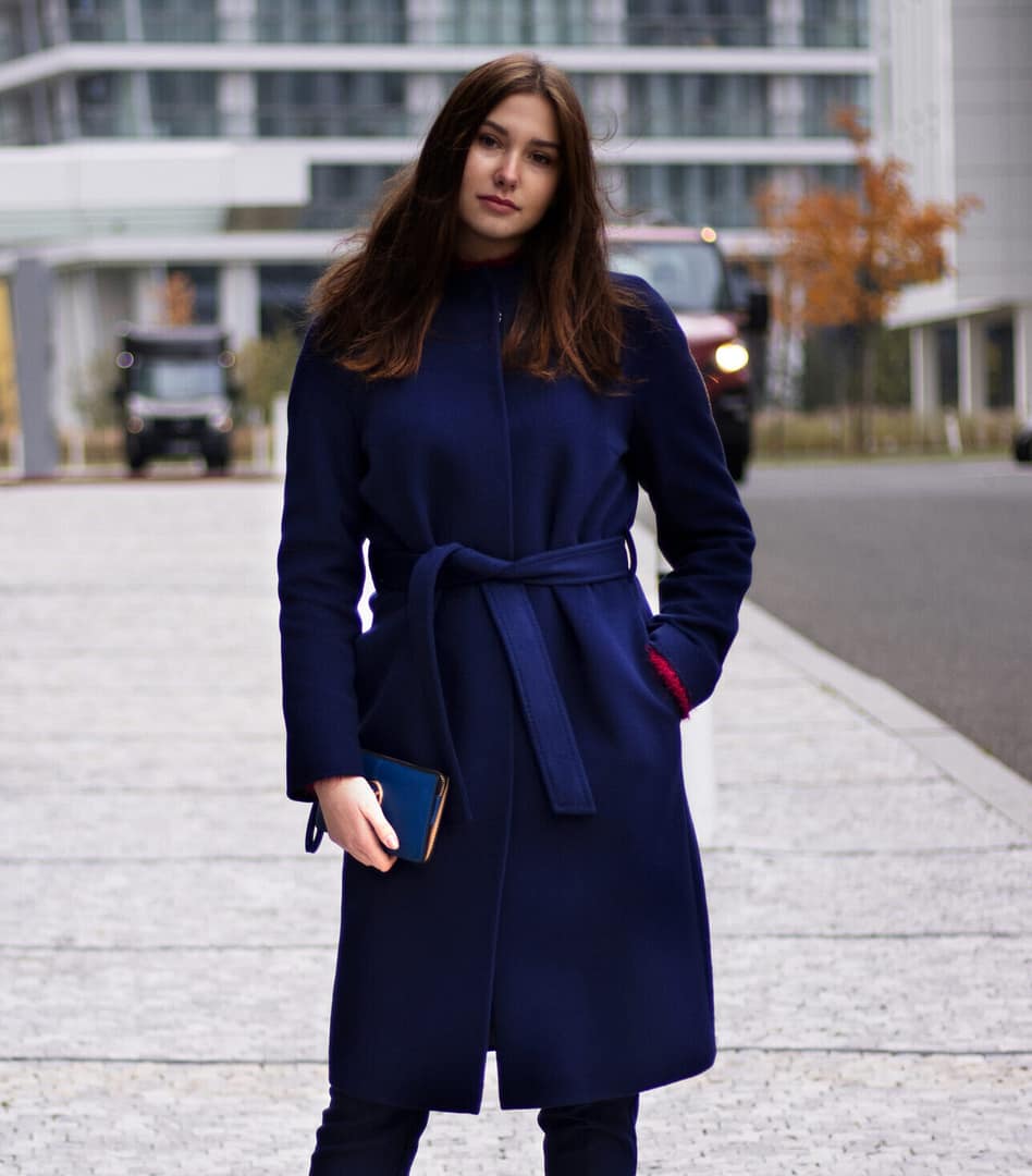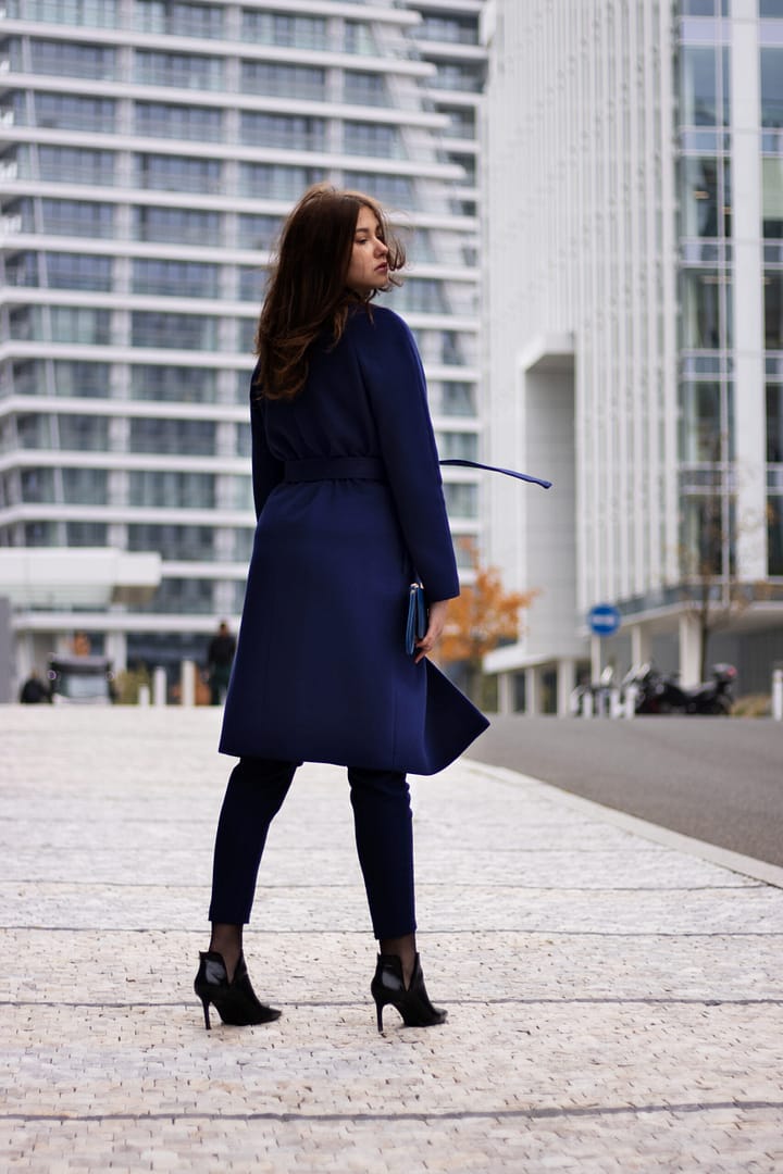 Kabát v elegantní tmavě modré barvě s odleskem do tmavě fialového odstínu. Jeho tulipánový střih bez fazónky s kulatým přiléhavým výstřihem s mírným vyvýšením jakoby do stojáčku je ideální pro ženy se štíhlými nohami. Zvýraznění ramen vycpávkami v raglánových rukávech a doplňkové zavazování kabátu páskem, dotváří ženský look. Prošitím okraje průkrčníku, okrajů rukávů a okrajů opasku AMF štepem (vzhled ručního štepování) získává kabát pečeť velmi vysoké kvality. Kabát je po celé délce zapínaný na dizajnové obří stiskací patentky, které jsou ručně našívané. Tento model vás zahřeje i ve velmi nepříznivém počasí. Zárukou je složení ze 100% vlny a vyšší gramáž flauše.