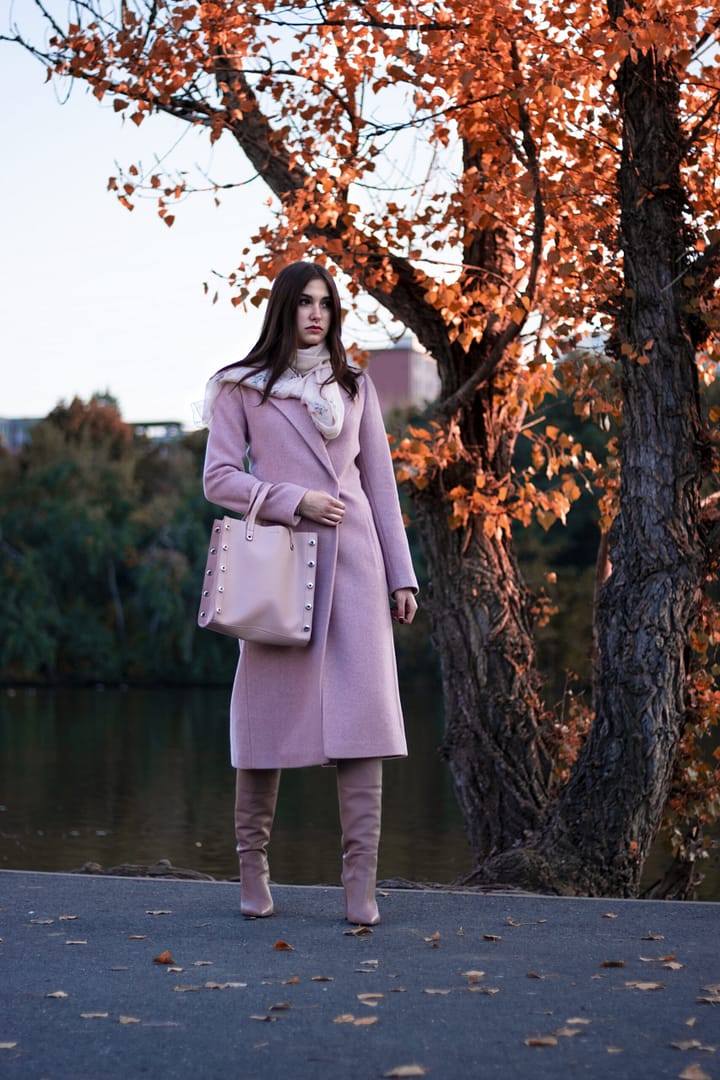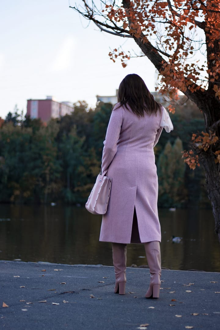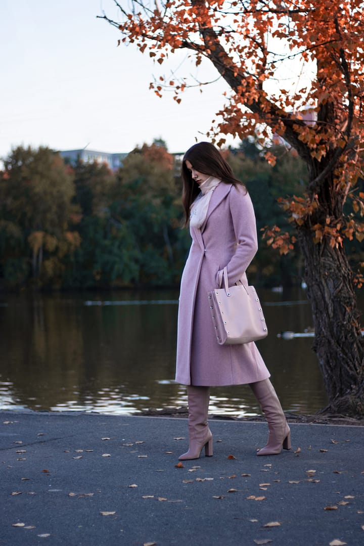 Kabát v pudrově růžové barvě, která je hitem letošní zimní sezóny s efektem lomeného kepru. Jeho vyštíhlená silueta s rozhalenou fazónkou má velmi zeštíhlující efekt. Tento střih vytváří krásnou pasovou linii. Kabát má zapínání na dizajnové obří stiskací patentky, které jsou ručně našívané. Vysoký podíl vlny zaručí výhřevnost kabátu. Podšívka je v kontrastnější růžové barvě čímž kabát vybočuje z tradiční jednolitosti.