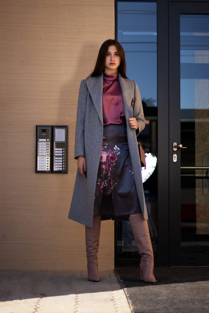 Kabát v nadčasové šedé barvě s jemnou strukturou rybí kosti je sametově hebký. Jeho vyštíhlená silueta s rozhalenou fazónkou má velmi zeštíhlující efekt. Tento střih vytváří krásnou pasovou linii. Kabát má zapínání na dizajnové obří stiskací patentky, které jsou ručně našívané.