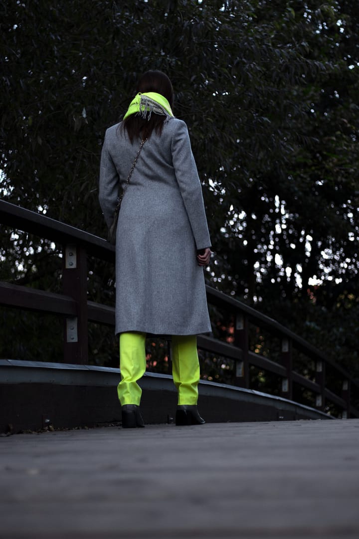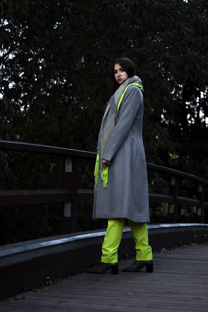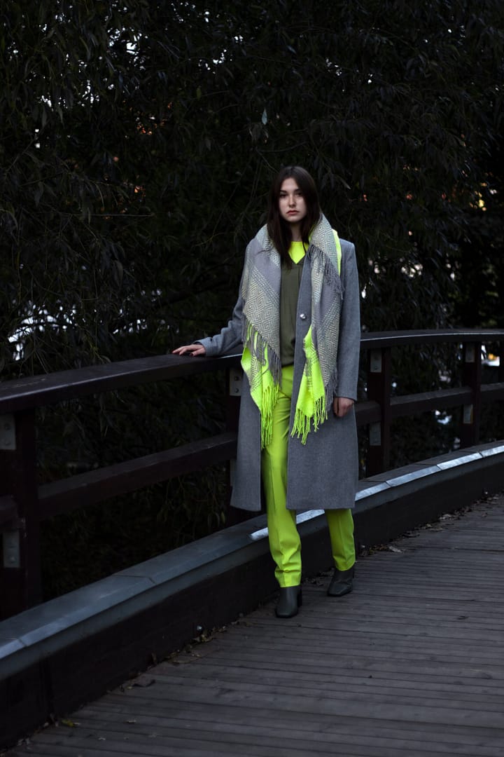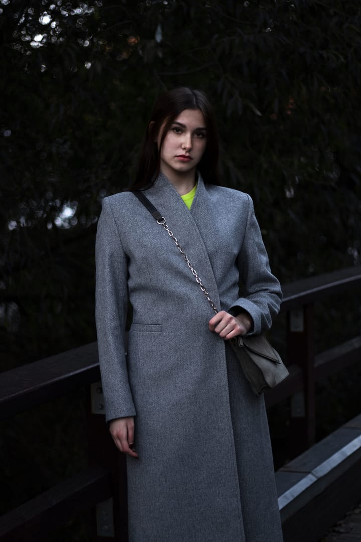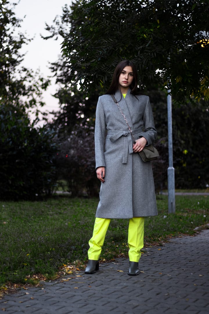 Kabát v nadčasové šedé barvě s jemnou strukturou rybí kosti je sametově hebký. Jeho vyštíhlená silueta s dvouřadým zapínáním a vyvýšeným stojáčkovým límcem má velmi zeštíhlující efekt. Kabát má zapínání na dizajnové obří stiskací patentky, které jsou ručně našívané. Kabát lze nosit bez pásku nebo s páskem.