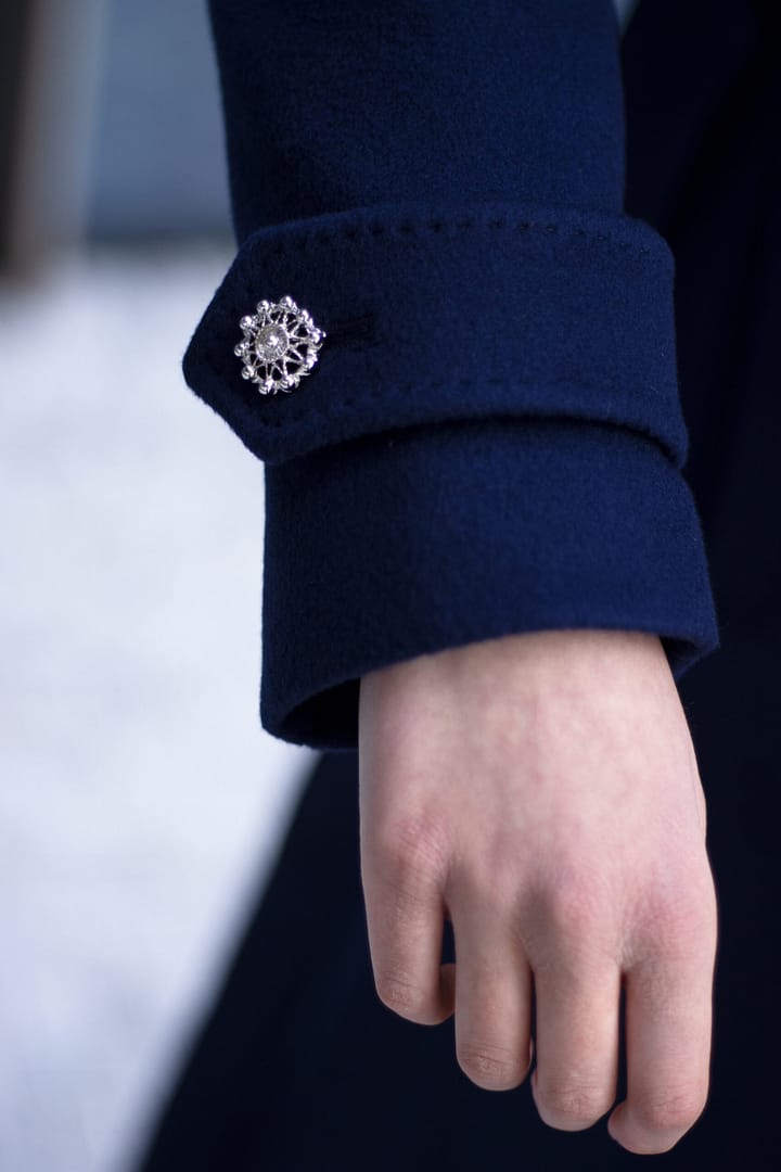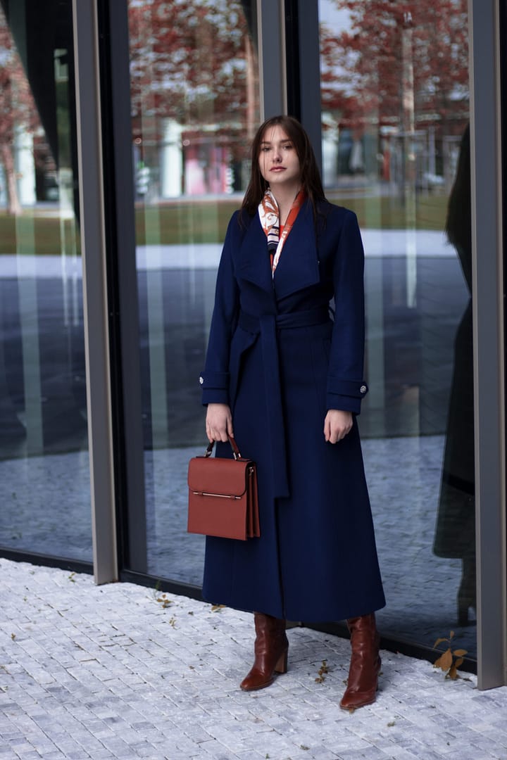 Nejdelší kabát v naší nabídce je v elegantní tmavě modré barvě s odleskem do tmavě fialového odstínu. Prošitím okraje rozhalenkové fazónky, předních dílů, zápinek rukávů a lišt kapes AMF štepem (vzhled ručního štepování) získává kabát pečeť velmi vysoké kvality. Jeho vyštíhlená silueta s rozhozenou spodní částí a vyvýšeným stojáčkovým límcem má velmi zeštíhlující efekt. Kabát má zapínání na dizajnové stříbrné knoflíky s očkem a obří stiskací patentky, které jsou ručně našívané. Dizajnové knoflíky jsou i na zápinkách rukávů. Kabát je dodáván s páskem. Tento model vás zahřeje i ve velmi nepříznivém počasí. Zárukou je složení ze 100% vlny a vyšší gramáž flauše.