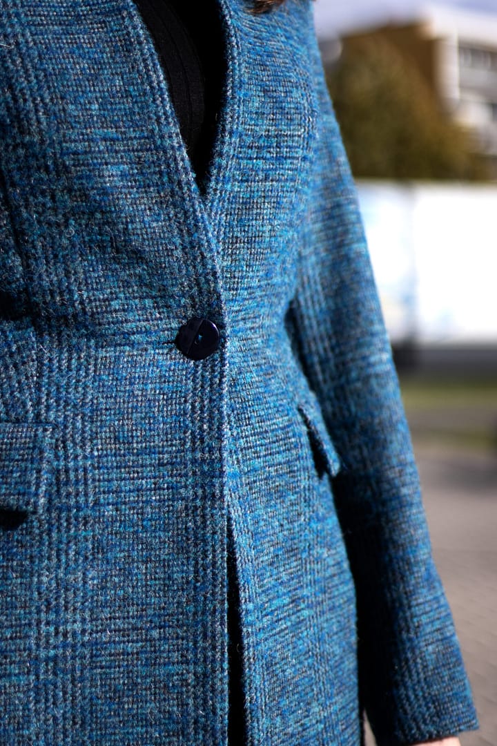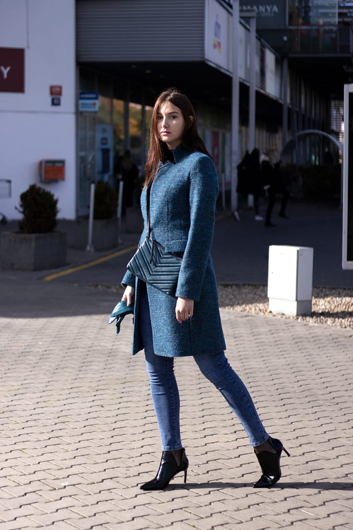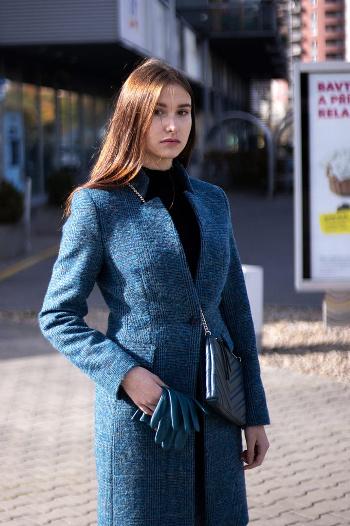 Kabát na každodenní nošení ale i na menší slavnostní příležitost je v elegantní petrolejově modré barvě s kostkovaným dizajnem. Kostkovaný dizajn nám vládne již druhou sezónu. Vyštíhlená silueta kabátu s obrácenou fazónkou a vyšším stojáčkovým límcem má velmi zeštíhlující efekt. Kabát má zapínání na jeden knoflík. Tento model vás určitě zahřeje, zárukou je složení se 64-mi procenty vlny a vyšší gramáž flauše. Vložením kontrastní šálky do výstřihu docílíte zvýraznění zajímavého střihu obrácené fazónky a současně i vyššího zateplení v této partii.