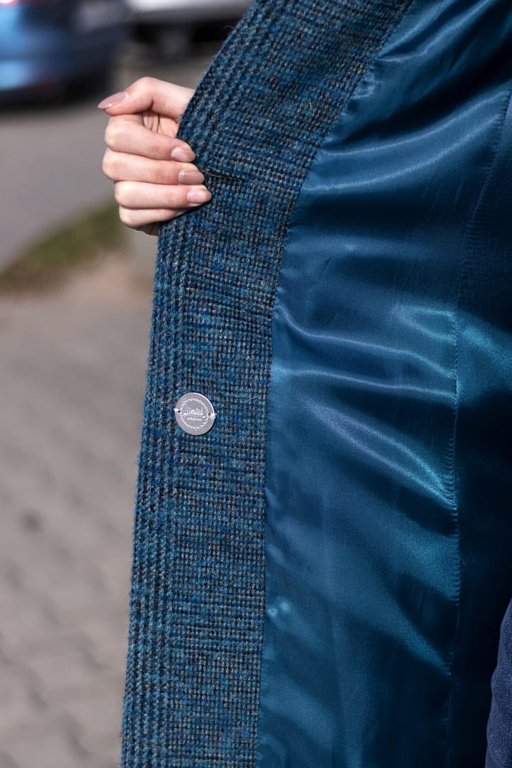 Kabát vyštíhlený s tzv. obrácenou fazónkou 95 cm dlouhý v barvě petrolejově modré s kostkovým dizajnem.
