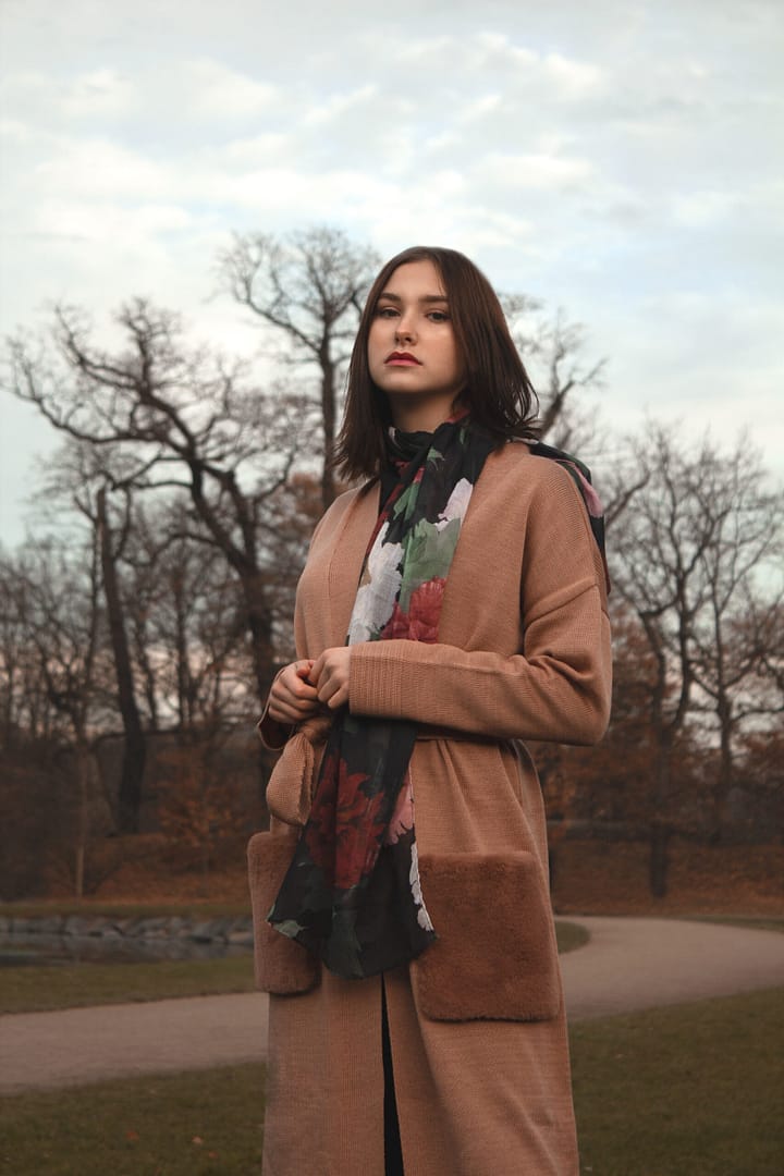 Krátký kardigan upletený z hebkého objemovaného polyakrylonitrilu, s vyšším stojákovým šálovým límcem, se zavazováním na pletený pásek. Kardigan získává na módním looku kapsami z umělé kožešiny. Dodáván v krabici, která zabrání nevzhlednému pomačkání během expedice.
