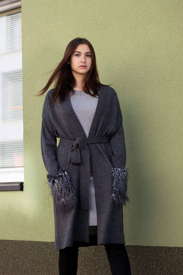 Krátký kardigan upletený z hebkého objemovaného polyakrylonitrilu, s vyšším stojákovým šálovým límcem, se zavazováním na pletený pásek. Kardigan získává na módním looku kapsami z umělé kožešiny vzhledu dikobraz. Dodáván v krabici, která zabrání nevzhlednému pomačkání během expedice.
